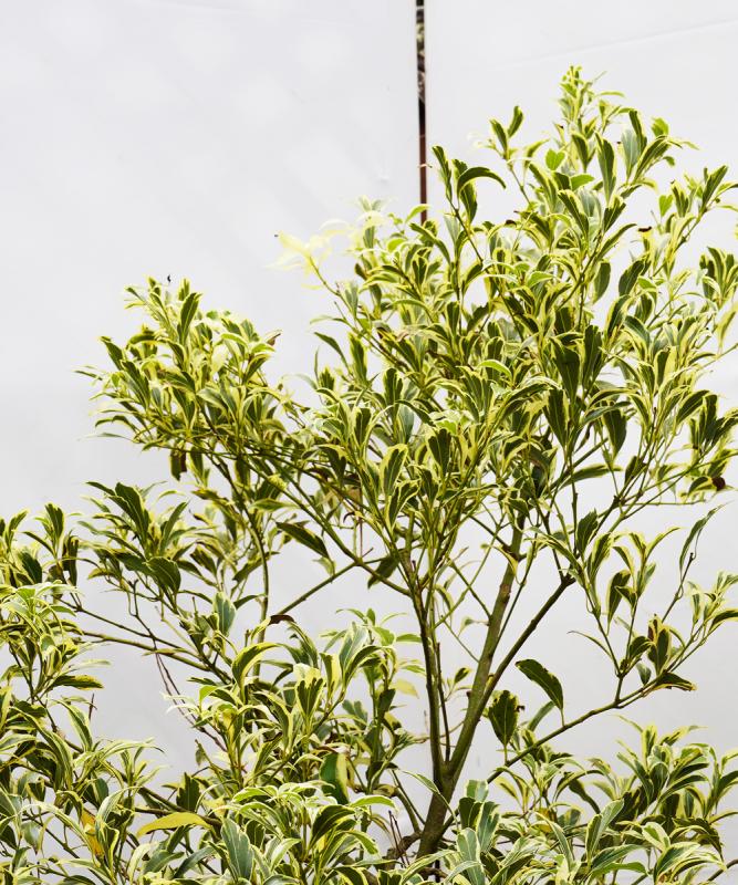 フイリヤブニッケイは、常緑樹の中でも数少ない斑入りで、さらに葉の細かい美しい木です。薄めの緑色の葉に、白い覆輪の斑が入ります。葉の茂りが良いので目隠しとしても使えます。