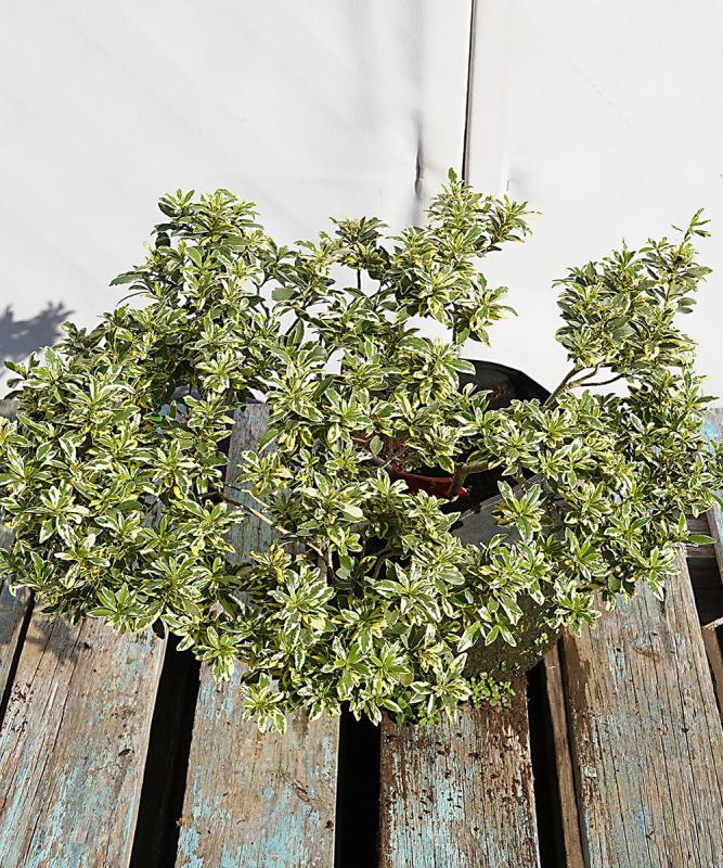小葉で斑入りの常緑低木は他にもいくつか見られますが、樹形ももこもことした雰囲気で刈り込むよりも放任して自然樹形にすると自然な風合いを楽しめます。