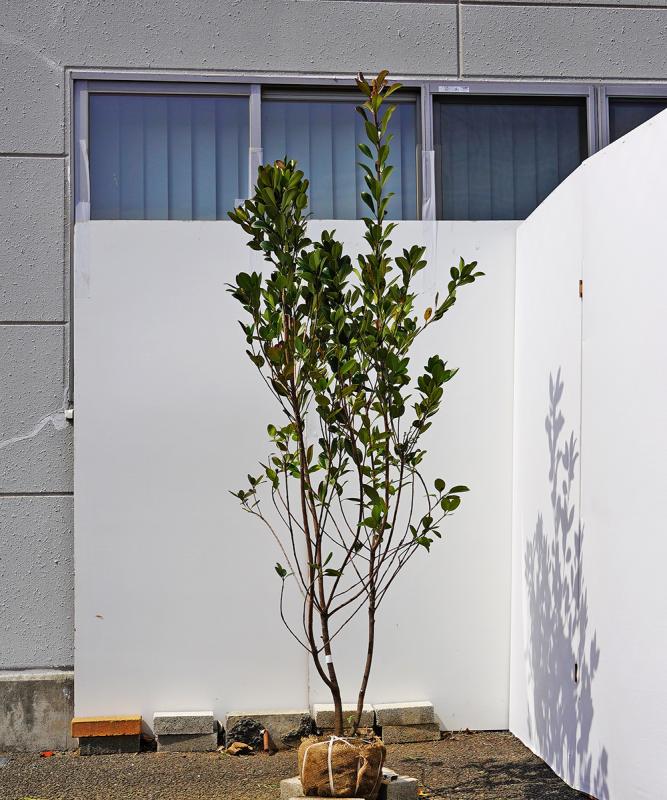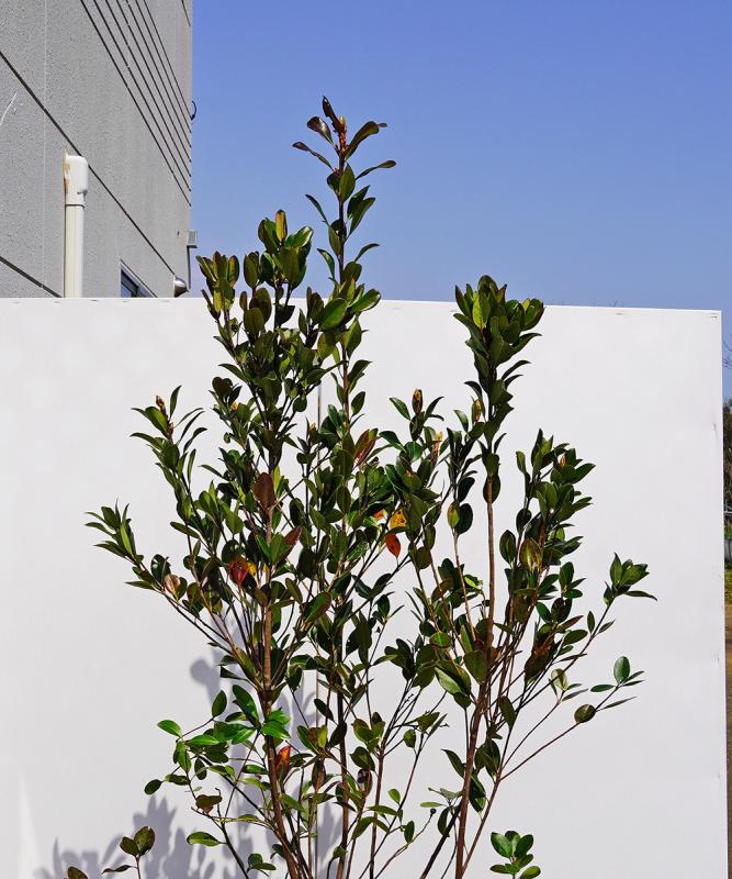 - シャリンバイは、日本の西部海岸沿いに自生する常緑の中木です。光沢があり丸みを帯びるかわいらしい葉っぱと梅に似た美しい花を咲かせます。刈込にも耐えるため一般的には生垣として使用されることが多いですが、こちらはあえて自然樹形になるように育てた珍しいタイプの樹形です。ここから刈り込んで生垣にするというよりは、放任で広がる枝ぶりを楽しんでいただきたいです。病害虫に強く、また大気汚染や塩害にも強いため、大通り沿いや沿岸部でも安心して植えつけることができます。管理の少ない初心者の方にもおすすめの植物です。