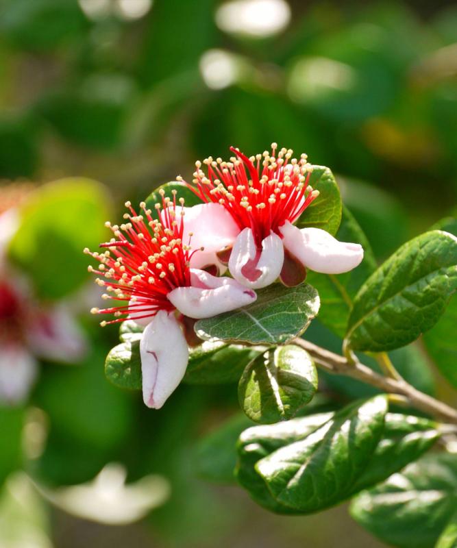 - フェイジョアは、南米原産の常緑果樹です。日本では果物としては定着せず、そのまま家庭菜園用の果樹となりましたが、常緑で丸く青みがかった葉色が特徴的で、あまり大きくならない庭木として近年注目されています。しかし、フェイジョアは果樹として販売されることが多いため、樹形が整ったものが多くありません。こちらは、庭木として使えるように樹形をきれいに仕立てています。もともとは中木に近いため、最終樹高はそれほど大きくなりません。なのでそこそこの大きさで、樹形をきれいに仕立ててあるものはあまり販売されていません。こちらのフェイジョアは品種不明のため花が咲いても結実しない場合があります。