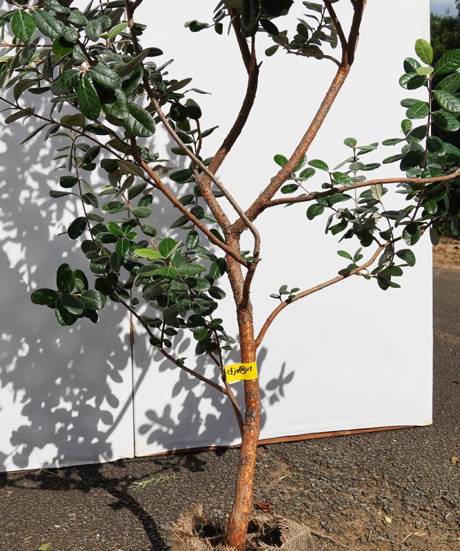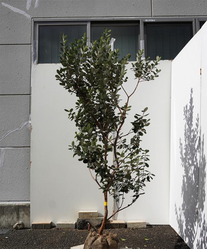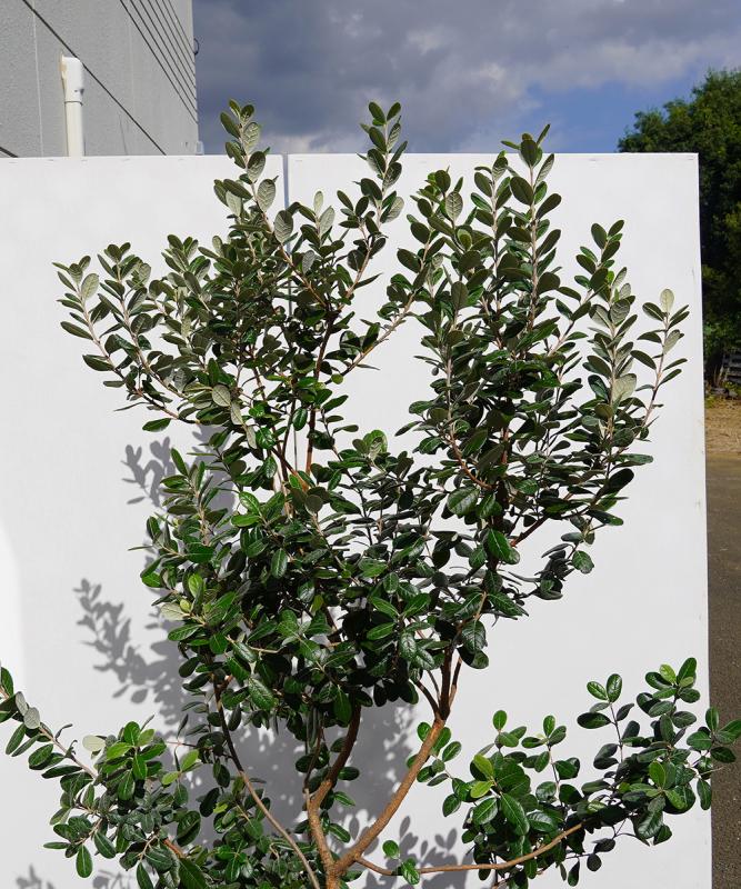 - フェイジョアは、南米原産の常緑果樹です。日本では果物としては定着せず、そのまま家庭菜園用の果樹となりましたが、常緑で丸く青みがかった葉色が特徴的で、あまり大きくならない庭木として近年注目されています。しかし、フェイジョアは果樹として販売されることが多いため、樹形が整ったものが多くありません。こちらは、庭木として使えるように樹形をきれいに仕立てています。もともとは中木に近いため、最終樹高はそれほど大きくなりません。なのでそこそこの大きさで、樹形をきれいに仕立ててあるものはあまり販売されていません。こちらのフェイジョアは品種不明のため花が咲いても結実しない場合があります。