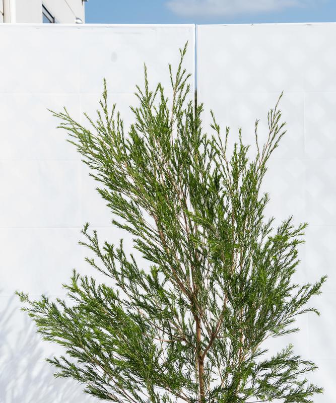 メラレウカレボリューショングリーンは、メラレウカ属のティーツリーです。ティーツリーの主な種類であるレプトスペルマム属とと比べると、動物の毛並みのようなさらっとした葉っぱと羽状の白い花を咲かせます。