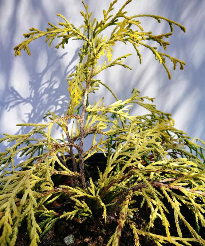 - フィリフェラオーレアの近縁種で枝先が垂れてほふく性のような樹形です。枝の根元は緑色で遠目からみると黄緑色が美しい品種です。冬は見事な黄金色になります。