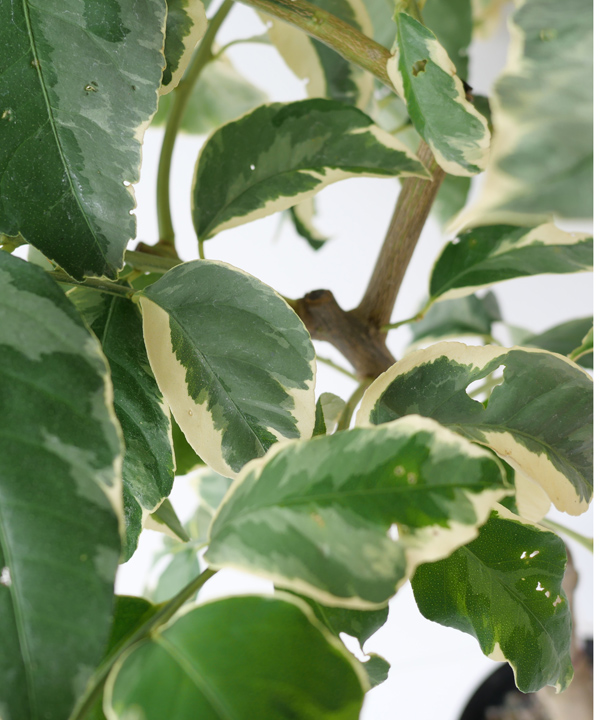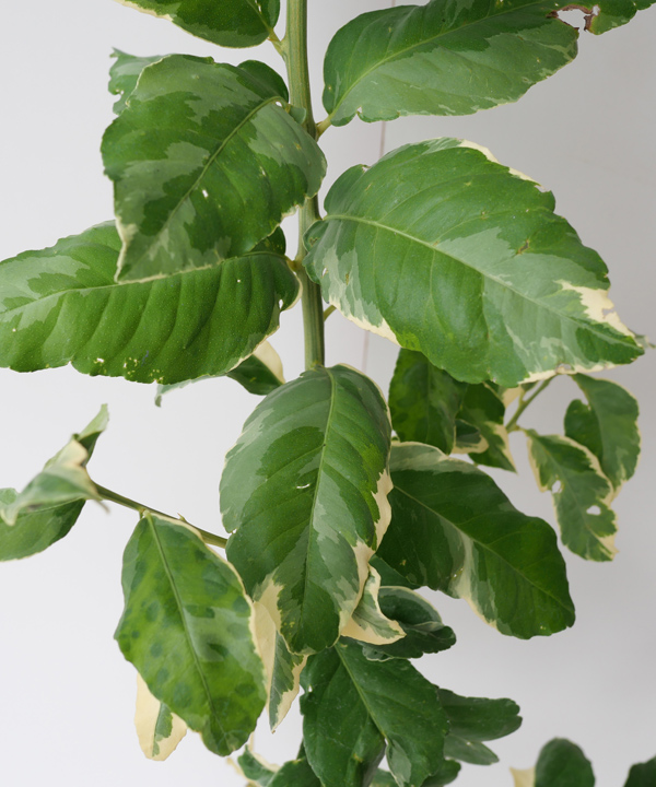 - 日本でも暖地に地植えできる常緑低木です。光沢のある葉はレモンでも珍しい斑入りで実にも緑×黄色の縞斑が入っています。