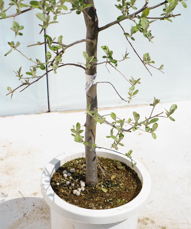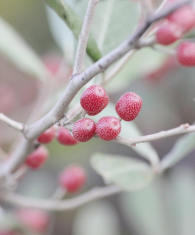 シルバーリーフの樹木の中でも、ひときわキラキラと輝く美しい葉が目を惹きます。樹形は暴れやすいですが剪定に強いため、きれいな樹形を維持することが可能です。また春に小さく白い花と秋に赤い実を楽しむこともできます。