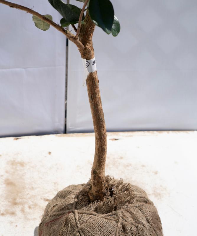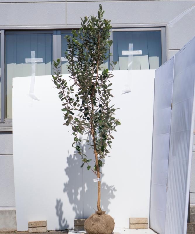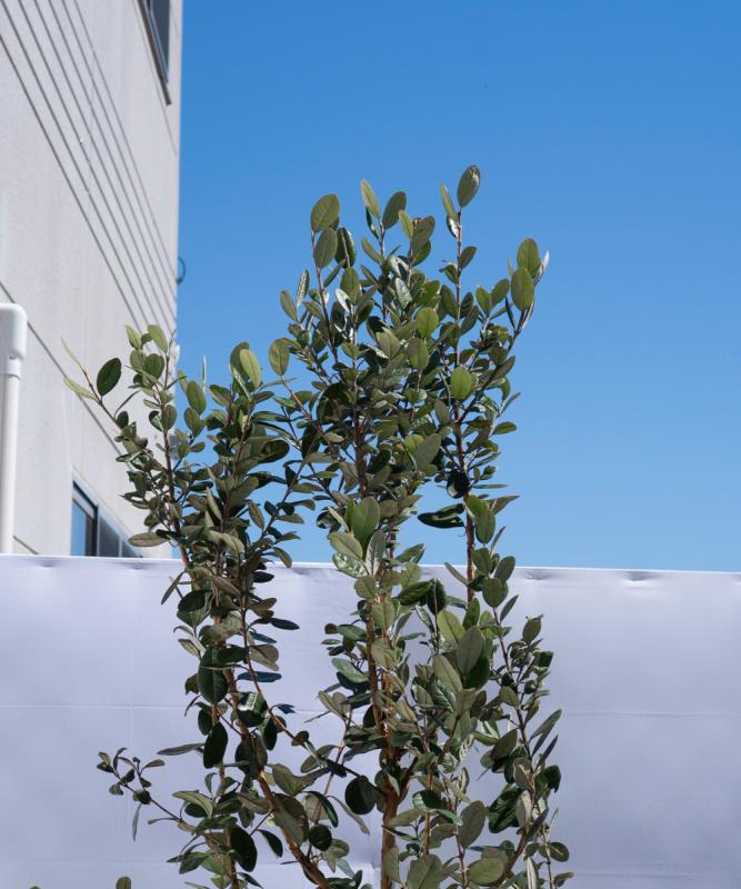 - フェイジョアは、南米原産の常緑果樹です。日本では果物としては定着せず、そのまま家庭菜園用の果樹となりましたが、常緑で丸く青みがかった葉色が特徴的で、あまり大きくならない庭木として近年注目されています。しかし、フェイジョアは果樹として販売されることが多いため、樹形が整ったものが多くありません。こちらは、庭木として使えるように樹形をきれいに仕立てています。もともとは中木に近いため、最終樹高はそれほど大きくなりません。なのでそこそこの大きさで、樹形をきれいに仕立ててあるものはあまり販売されていません。こちらのフェイジョアは品種不明のため花が咲いても結実しない場合があります。