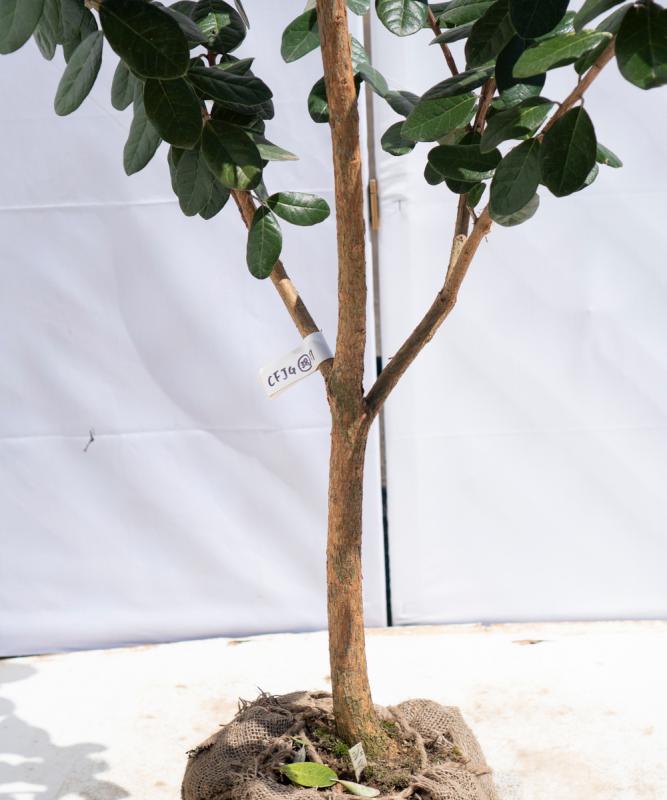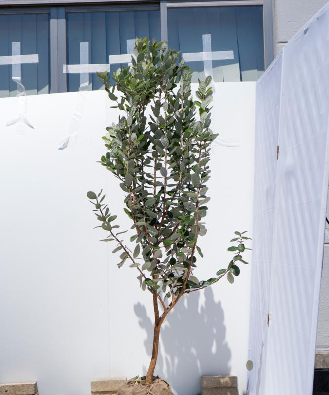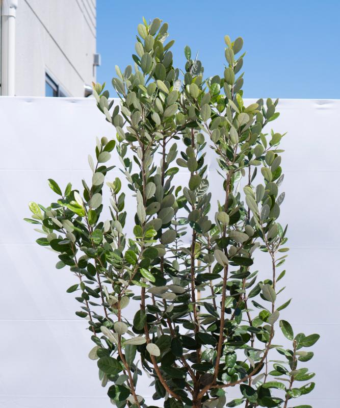 - フェイジョアは、南米原産の常緑果樹です。日本では果物としては定着せず、そのまま家庭菜園用の果樹となりましたが、常緑で丸く青みがかった葉色が特徴的で、あまり大きくならない庭木として近年注目されています。しかし、フェイジョアは果樹として販売されることが多いため、樹形が整ったものが多くありません。こちらは、庭木として使えるように樹形をきれいに仕立てています。もともとは中木に近いため、最終樹高はそれほど大きくなりません。なのでそこそこの大きさで、樹形をきれいに仕立ててあるものはあまり販売されていません。こちらのフェイジョアは品種不明のため花が咲いても結実しない場合があります。