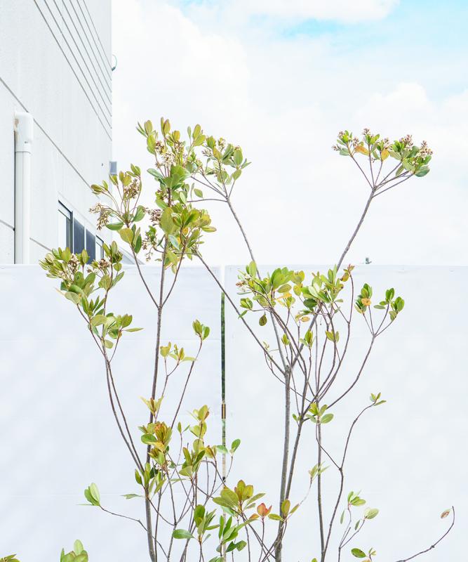- シャリンバイは、日本の西部海岸沿いに自生する常緑の中木です。光沢があり丸みを帯びるかわいらしい葉っぱと梅に似た美しい花を咲かせます。刈込にも耐えるため一般的には生垣として使用されることが多いですが、こちらはあえて自然樹形になるように育てた珍しいタイプの樹形です。ここから刈り込んで生垣にするというよりは、放任で広がる枝ぶりを楽しんでいただきたいです。病害虫に強く、また大気汚染や塩害にも強いため、大通り沿いや沿岸部でも安心して植えつけることができます。管理の少ない初心者の方にもおすすめの植物です。