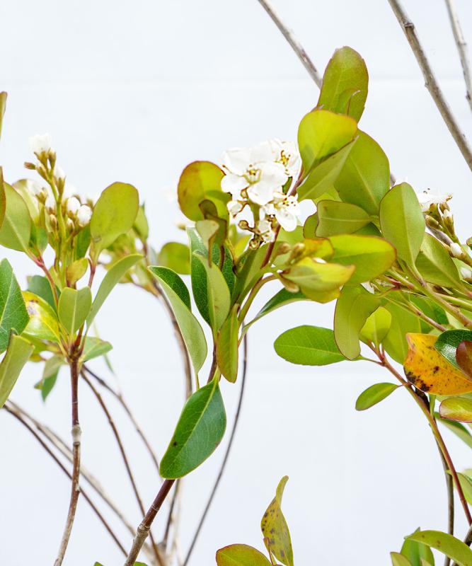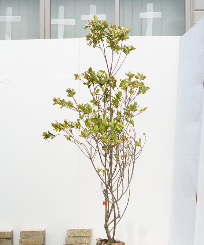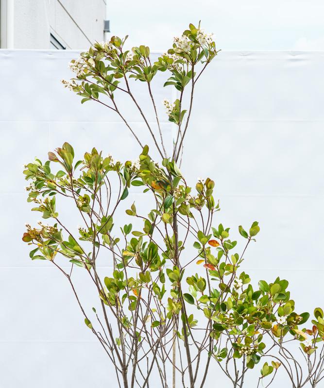 - シャリンバイは、日本の西部海岸沿いに自生する常緑の中木です。光沢があり丸みを帯びるかわいらしい葉っぱと梅に似た美しい花を咲かせます。刈込にも耐えるため一般的には生垣として使用されることが多いですが、こちらはあえて自然樹形になるように育てた珍しいタイプの樹形です。ここから刈り込んで生垣にするというよりは、放任で広がる枝ぶりを楽しんでいただきたいです。病害虫に強く、また大気汚染や塩害にも強いため、大通り沿いや沿岸部でも安心して植えつけることができます。管理の少ない初心者の方にもおすすめの植物です。