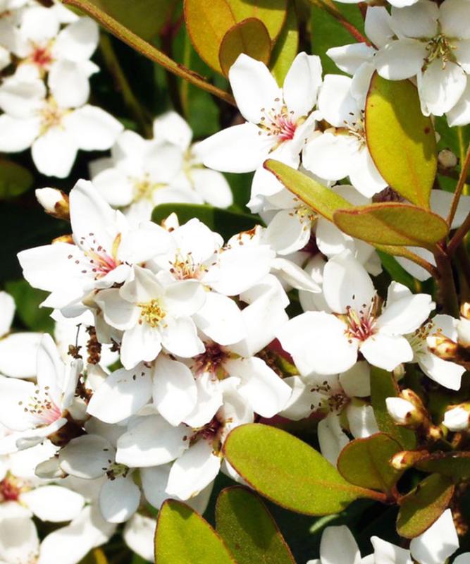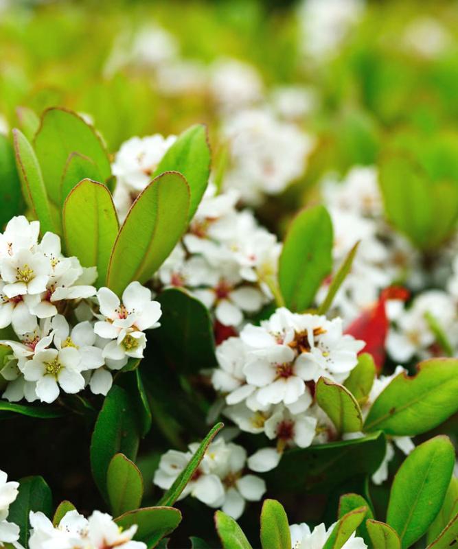 - シャリンバイは春になると、梅に似た白い花を咲かせます。刈り込みに強いので、生け垣としても使えますし、グランドカバーとして利用して大きく広がって来たら刈り込んで整えるという事も出来ます。使い勝手が良いので人気があります。また潮風にも強く沿岸地域でもよく植栽されています。