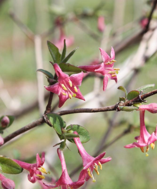 - ウグイスカグラ(鶯神楽)はウグイスの鳴く頃に花を咲かせるとも言われている木です。春を知らせるかのようにラッパ状の可愛いピンク色のお花を枝から下げるようにして咲かせます。