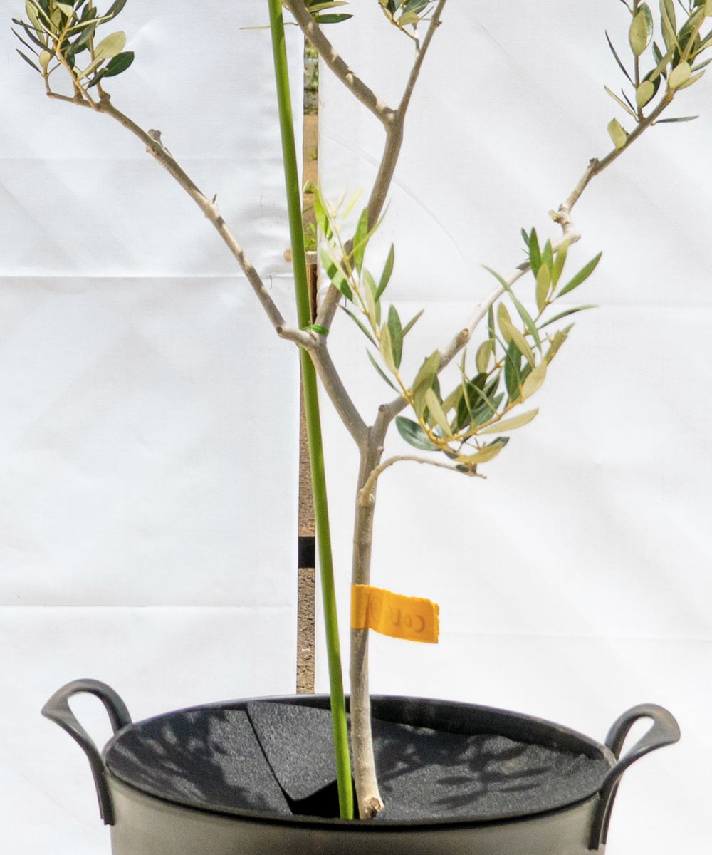 - オリーブアナアキゾウムシに注意が必要です。スミチオンを50倍に希釈したものを、5月~10月の間に幹に塗布すると効果的です。また消毒に自信のない方は、アルミホイルなどで幹の株元を保護し、物理的に進入できないようにします。