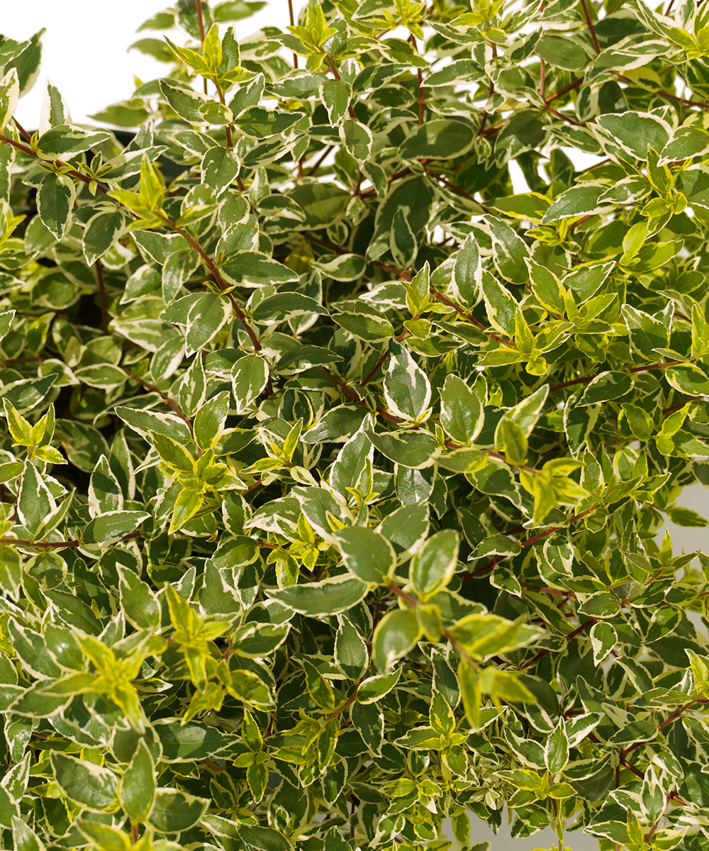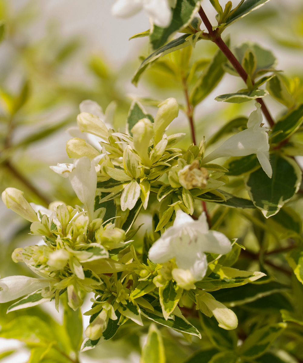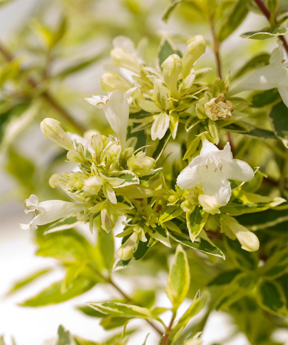 - アベリア「ラディアンス」は、アベリアの中でもシルバーグリーンとクリーム色の斑が入る爽やかな葉色の品種です。葉の表面に艶があるため、日に当たると光って見えます。1本あるだけでお庭を明るくしてくれます。冬は赤く紅葉し、新芽は黄金色を楽しむことが出来ます。本来のアベリアよりは耐寒性は低く、寒冷地等で寒さに当たると葉を落とすことがあります。