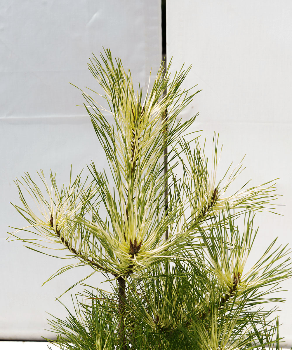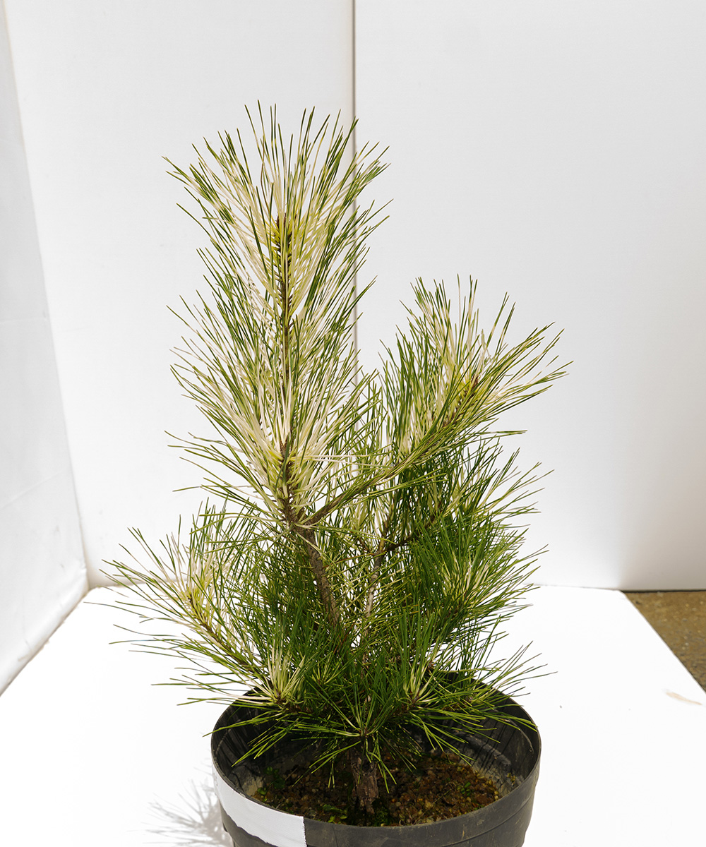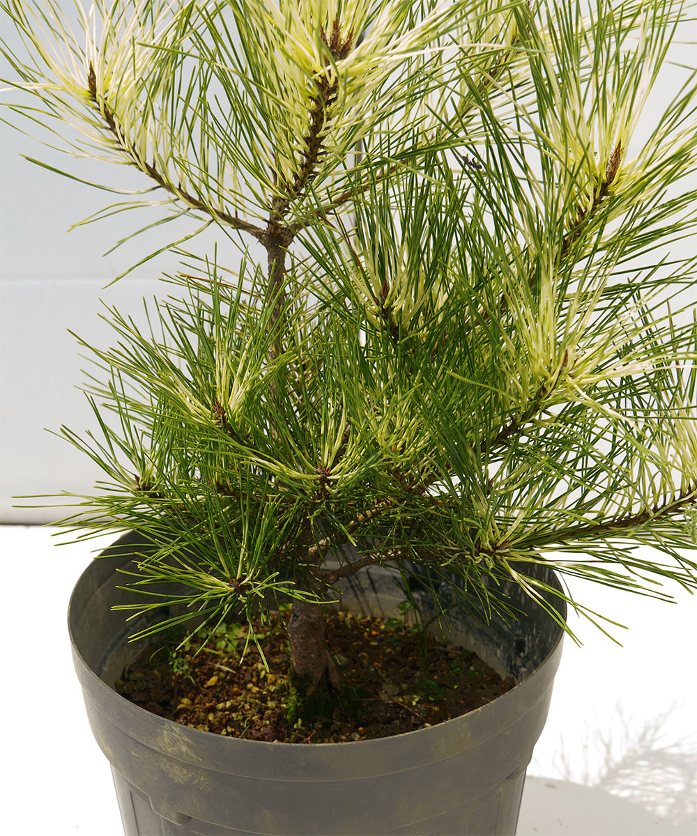 - アカマツ系の斑入り品種で、薄緑色の葉に明るい黄色の斑が入ります。斑の入りが縞模様になるジャノメマツの派生品種で、シロジャノメマツは縞模様はほぼ見られません。また斑もやや明るい印象です。白い斑の面積が大きいためジャノメマツよりも明るく見えます。伝統的な松の印象とは異なる明るくモダンな雰囲気を感じさせてくれます。令和のお庭になじませるために、去年伸びた枝およびその年に伸びた枝の半分程度「もみあげ」を行うと大変軽やかで良い意味で松らしからぬ印象になります。令和のお庭で新しい使い方のできる松です。