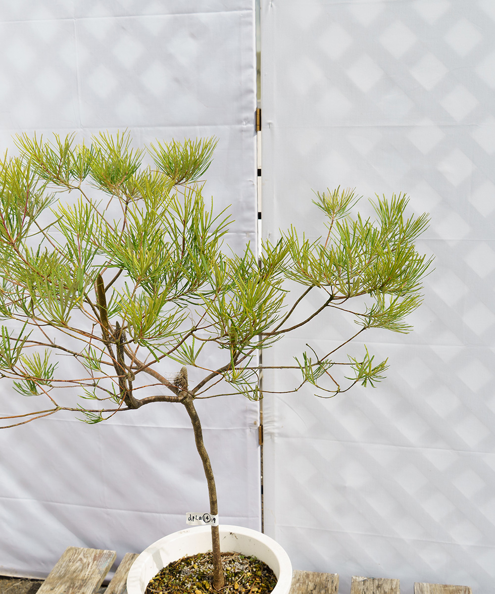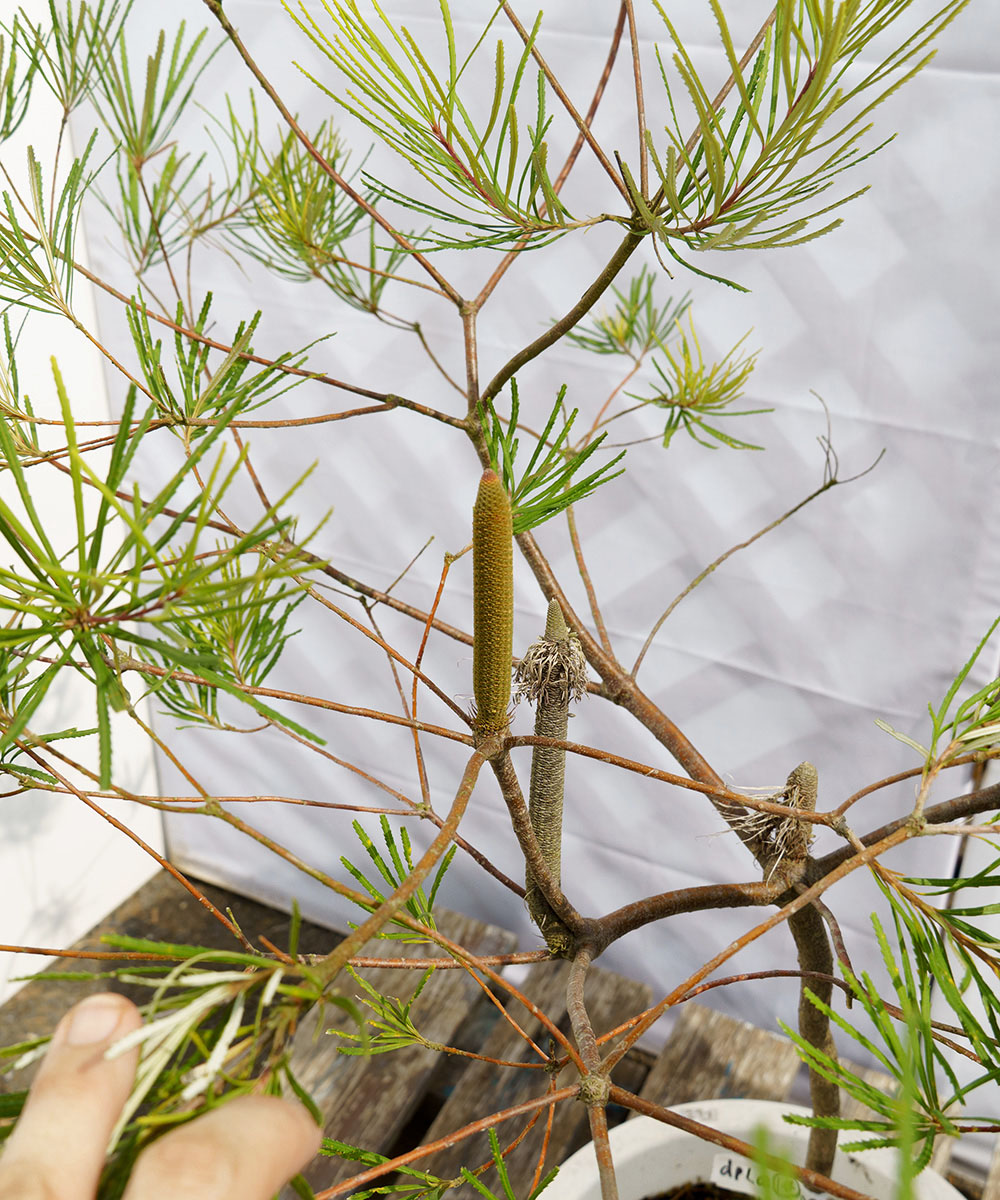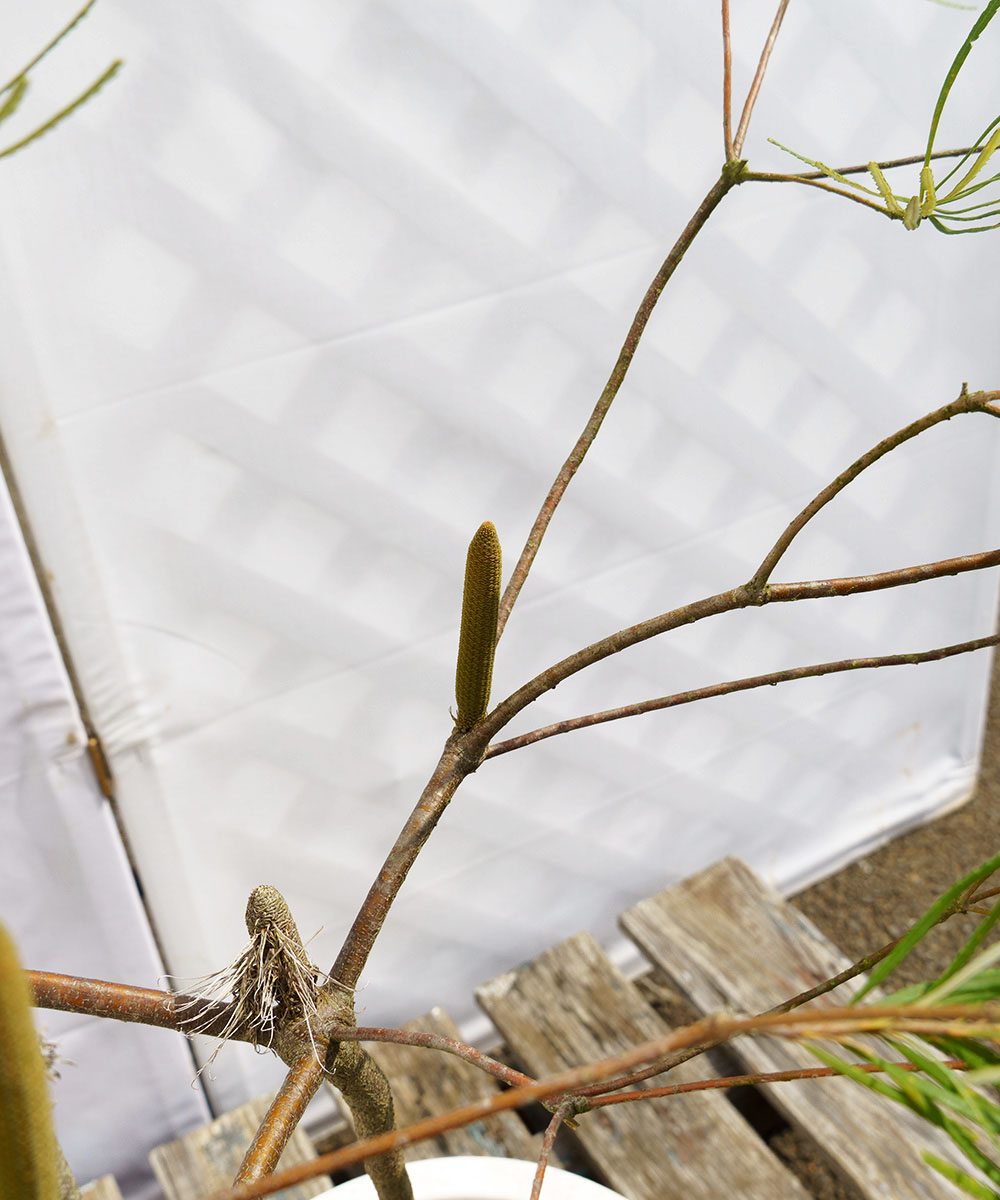 ヘアピンと呼ばれる種類はいくつかあり、花の色が少し違うと言われています。こちらは開花前の株の為、花色は特定できていません。生産量が少なく希少な種類と言われています。南国原産であるバンクシアの中では耐寒性がやや強く暖地であれば十分管理可能です。