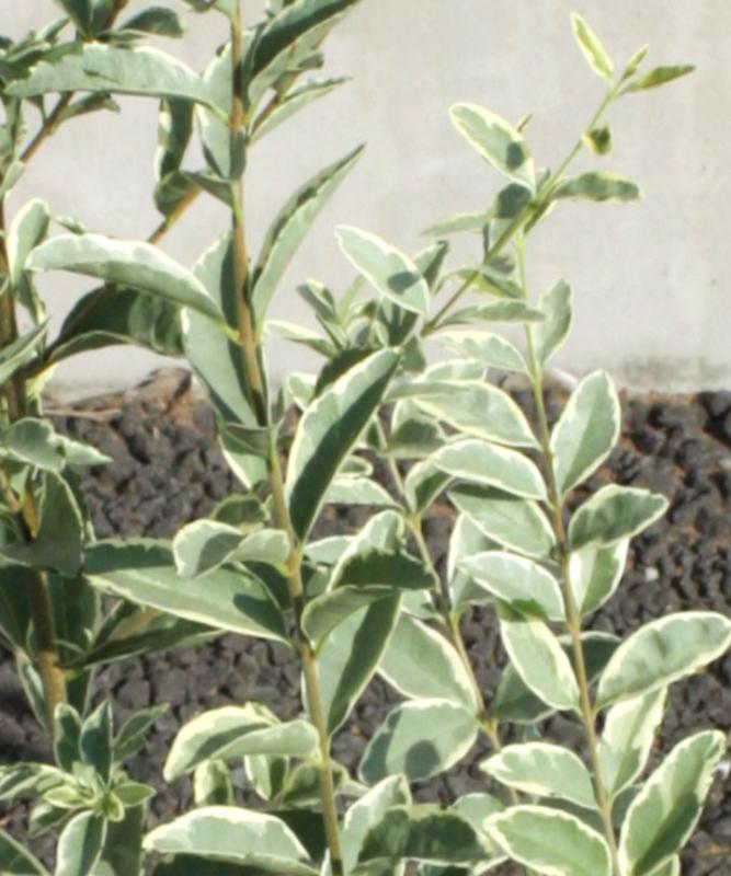 - プリペットの斑入りで、明るい雰囲気が特徴です。また花付きも旺盛で、葉色以外も楽しめます。刈り込みに強いため、洋風のお庭の生垣として人気が出ています。寒さに弱いため、冬場は葉を落とすなど、北関東程度の寒さまでしか植栽ができません。