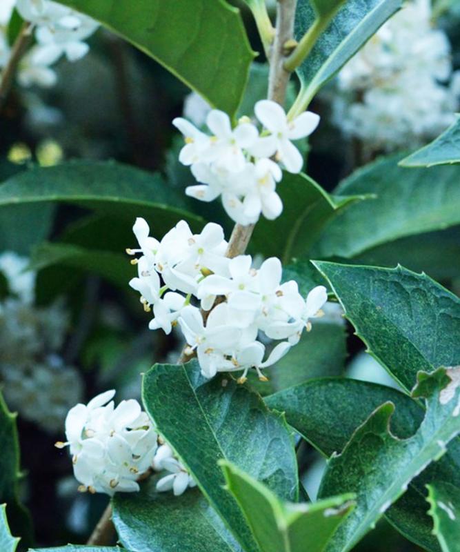 - ヒイラギモクセイは鋸歯(きょし)とよばれる葉の淵のトゲがヒイラギのように鋭いモクセイです。日陰にも強いことから、昔から防犯として植えられることが多く、家の裏側の生垣などに利用されました。また、魔よけや娘のいる家に植えるといいとされています。 白い花でキンモクセイほどではありませんが、程よい芳香があります。葉のトゲも白い花で穏やかな雰囲気にしてくれます。
