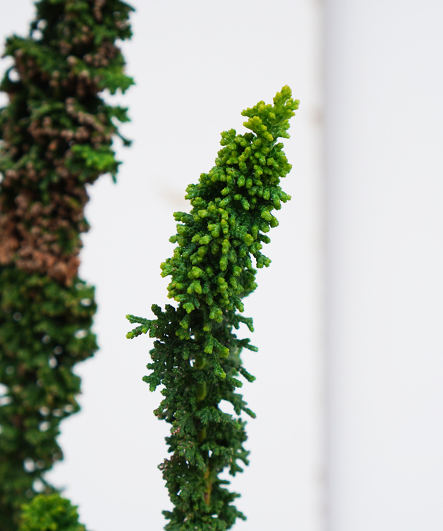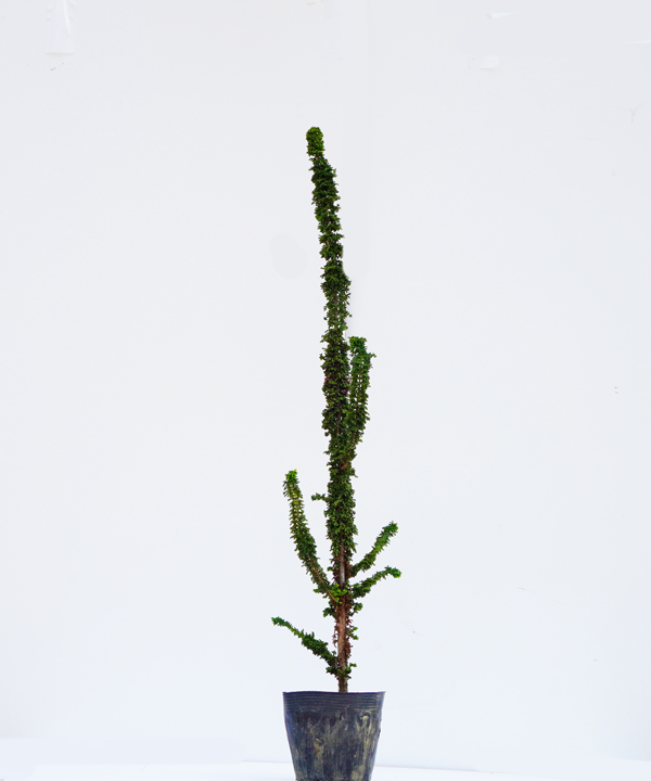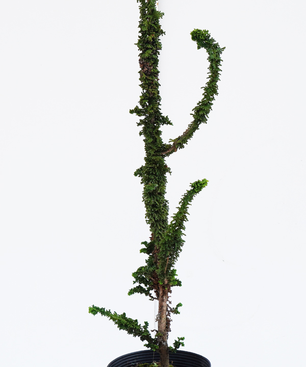 - 大変珍しい新しい形のコニファーです。葉はヒバの葉が縮れたようになり経年でところどころに枯葉が混ざります。枝はひょろひょろと伸びて様々な形になり、木ごとに樹形は大きく変わります。時にはうねうねとサボテンのようになったり個性的でインパクトのあるコニファーです。育て方は特に注意することもなく虫もつきにくいです。まだ生産が始まったばかりのもので生産数は安定しません。