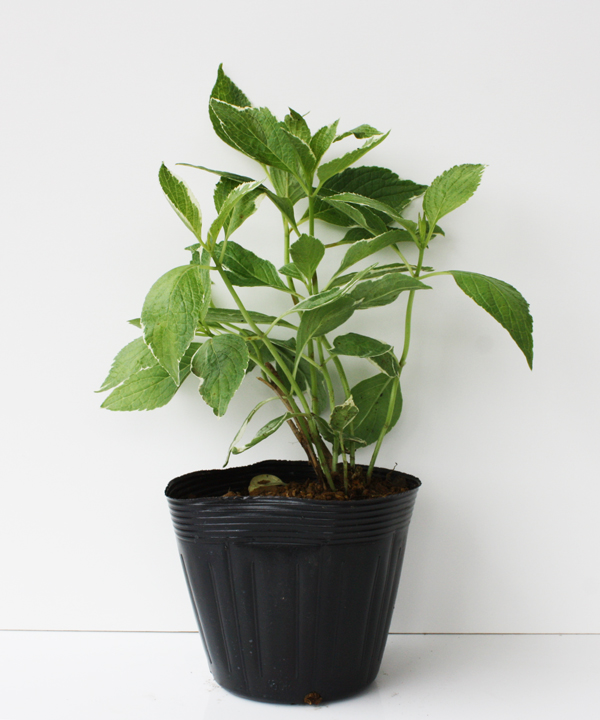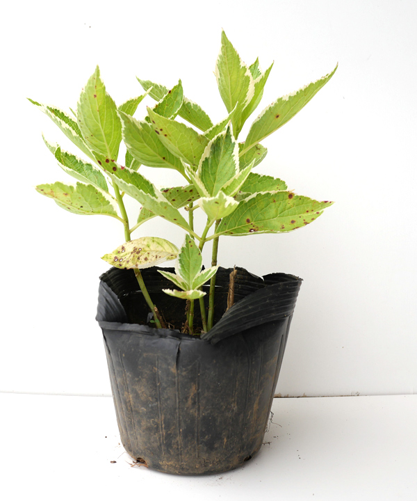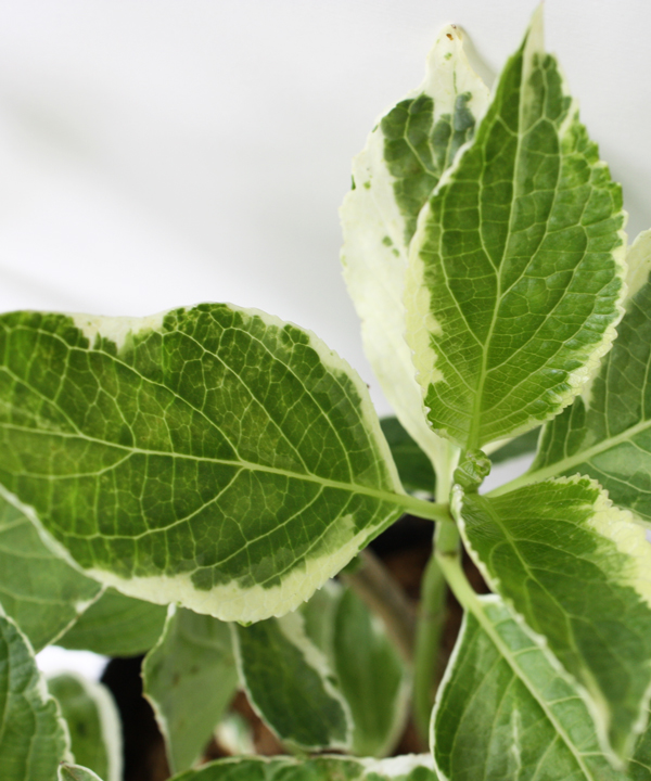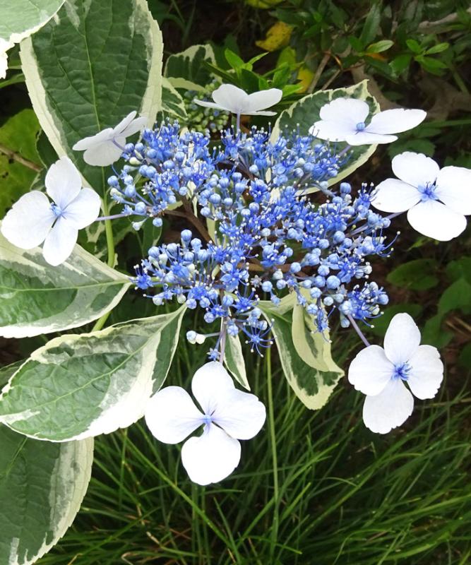 - ガクアジサイの葉に斑(ふ)の入った品種です。ガクアジサイよりも明るい印象になります。土壌の環境で花の色が変わり、主にアルカリ性だと赤紫色が強く出て、酸性だと青紫色が強くなります。その他、土壌の水質や栄養分などでも色が変わります。