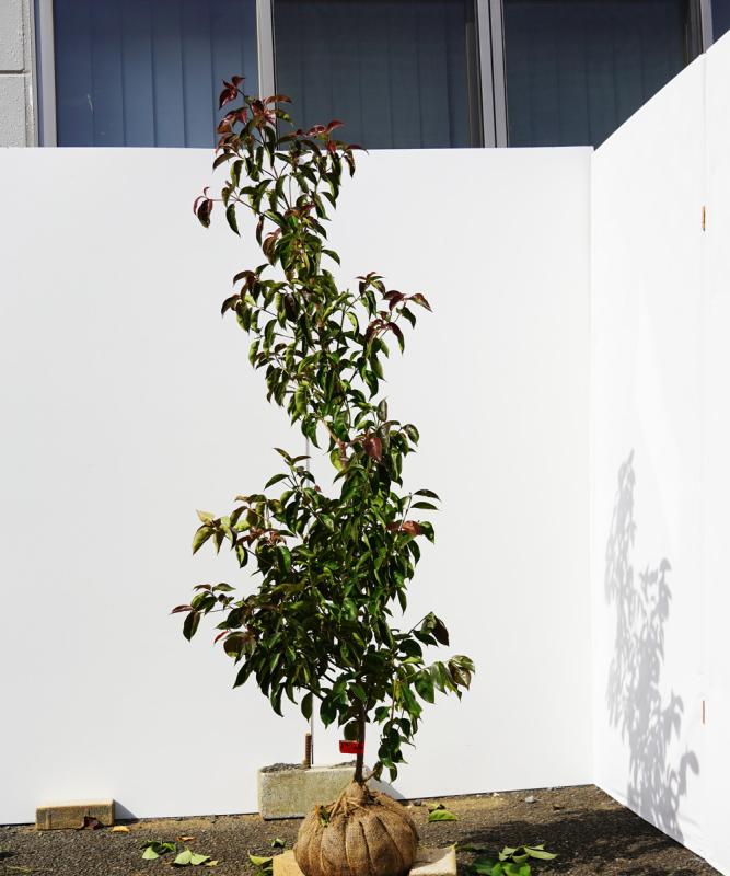 特徴的なのは、常緑ヤマボウシの中でも濃い赤色の花と、形が剣弁と呼ばれる花びら(ガク)の先が細くヤマボウシらしい形をしています。常緑ヤマボウシの白花定番品種ホンコンエンシスの花の形に似ています。更に幼葉が赤色をしていることから花の時期には、赤い花と幼葉の赤さを楽しむことができます。さらに、樹形も直立性を帯びておりまとまりやすくお庭でも育てやすくなっています。他の常緑ヤマボウシの赤花品種の中では生育は比較的緩やかです。