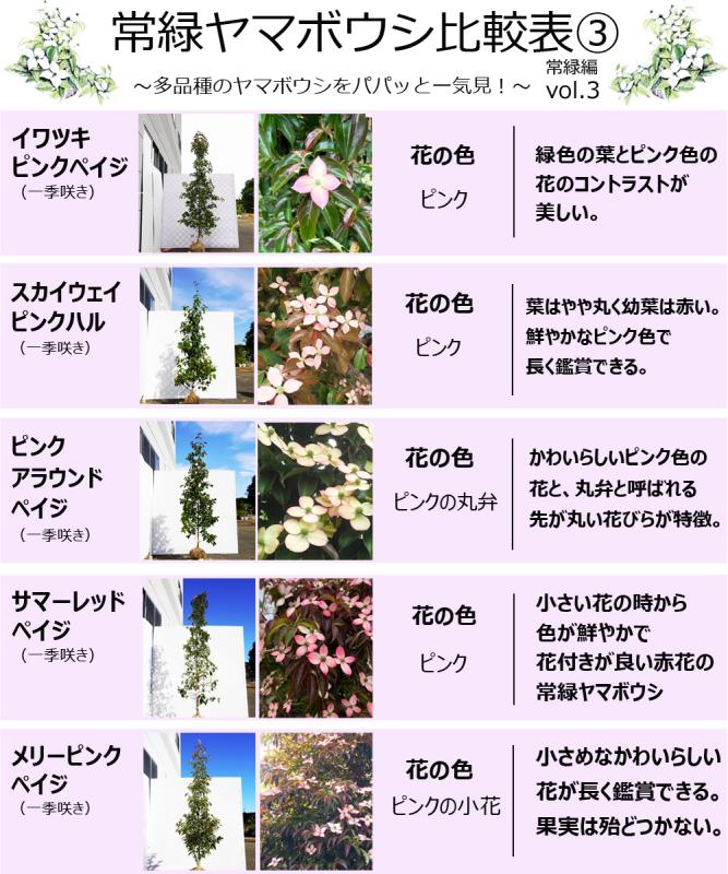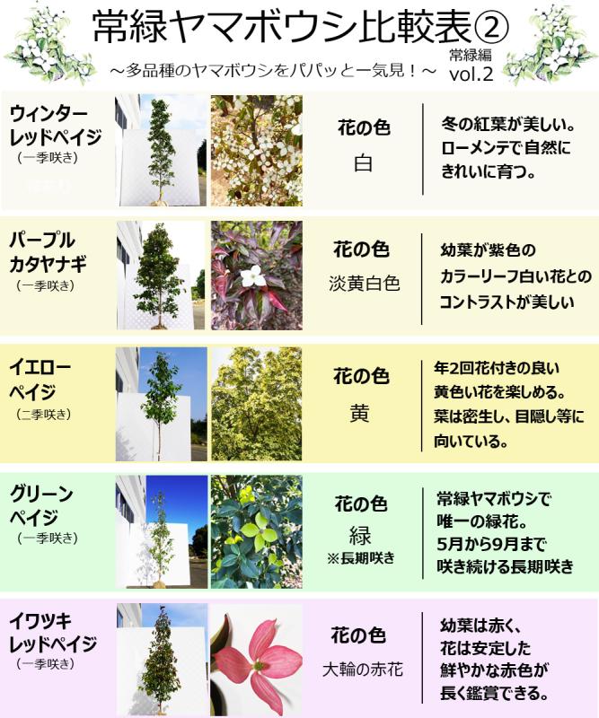 - 常緑ヤマボウシメリーピンクペイジは、同じ赤花の常緑ヤマボウシの中でも、小さめのかわいらしい花が楽しめる品種です。さらに、葉っぱも小葉でかわいらしいです。またもう一つの特徴は、実がつかないことです。花付はいいですが受粉しないため実はなりません。実が落ちて下が汚れたり鳥が来てしまう事が心配な方には安心できる品種です。そして、樹形も直立性を帯びておりまとまりやすくお庭でも育てやすくなっています。他の常緑ヤマボウシの中では生育は比較的緩やかです。