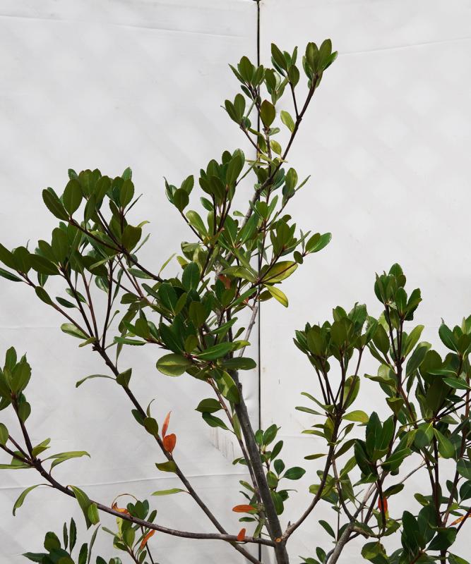 - シャリンバイは、日本の西部海岸沿いに自生する常緑の中木です。光沢があり丸みを帯びるかわいらしい葉っぱと梅に似た美しい花を咲かせます。刈込にも耐えるため一般的には生垣として使用されることが多いですが、こちらはあえて自然樹形になるように育てた珍しいタイプの樹形です。ここから刈り込んで生垣にするというよりは、放任で広がる枝ぶりを楽しんでいただきたいです。病害虫に強く、また大気汚染や塩害にも強いため、大通り沿いや沿岸部でも安心して植えつけることができます。管理の少ない初心者の方にもおすすめの植物です。