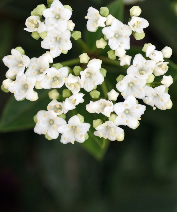 - ガマズミ属をビバーナムと呼び、その中でも常緑で楚々とした白い花と瑠璃色(コバルトブルー)の実を楽しむことができます。色の濃い葉色と赤い茎がお庭をきゅっと引き締めてくれます。常緑で花と実を楽しめる、数少ない植物です。同じビバーナムのダビディと見た目が似ていますがシナモミフォリュームの方が花付きが良く、花を楽しみたい方はこちらがおすすめです。