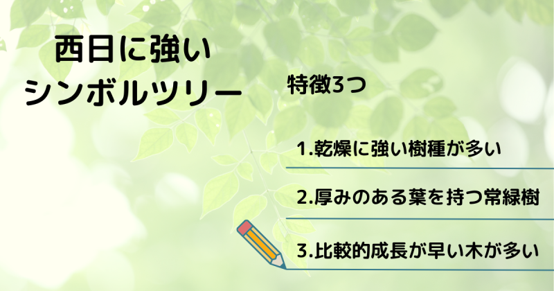 そこでここでは、西日に強いシンボルツリーの3つの特徴をご紹介します。