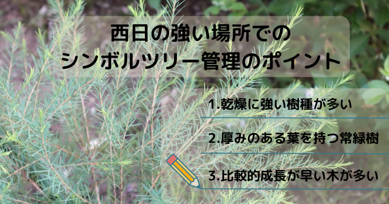 西日の強い場所でシンボルツリーを元気に育てるポイントは、以下の3つです。