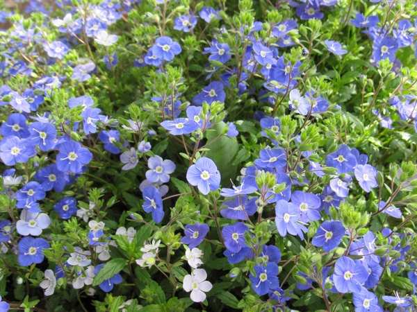 春に咲く青い小花と、ほんのり銅色がかった葉が美しいグランドカバー。